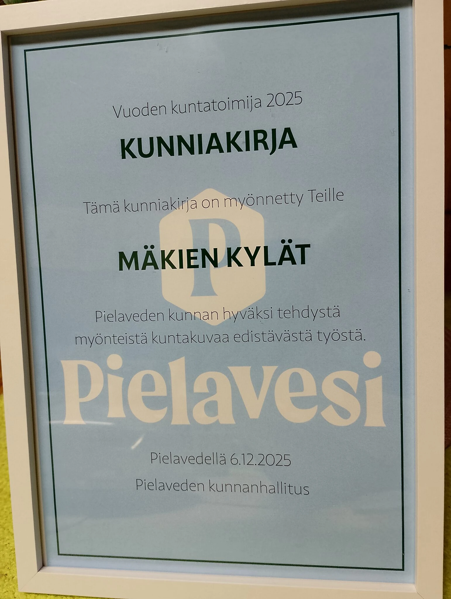 Mäkien kylät palkittiin Pielaveden kuntatoimijana 2025 itsenäisyyspäivän juhlassa 6.12. Suojalassa. Ehdokkaaksi päädyimme elinvoimatyöryhmän valitsemana kolmen muun ehdokkaan kanssa. Kuntalaisten äänestyksen perusteella huomionti kohdistui meille. Perusteluina valinnalle on, että Mäkien kylissä on tehty aktiivisesti töitä maaseutumaisen ympäristön esille tuomiseksi ja maaseutumatkailun edistämiseksi Pielavedellä. Kylien alueelle on mm. suunniteltu ja toteutettu tarinallisia pyöräilyreittejä.